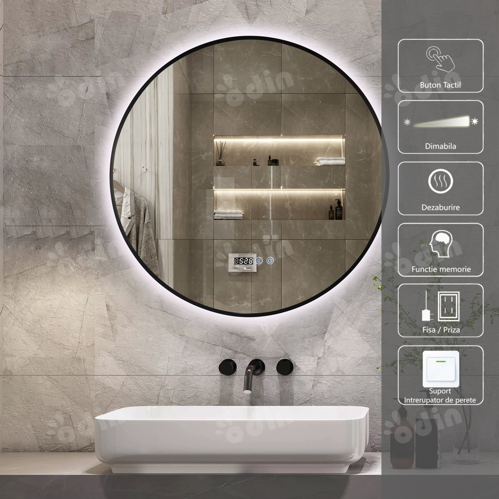 Caracteristici cheie | Iluminare LED, Ceas, Dezaburire, Buton touch ON/OFF |